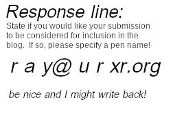 Please keep your emails short and to the point. Also, mention if you would like your submission to be considered for inclusion in the blog. First and last initials will be used unless you specify a pen name.